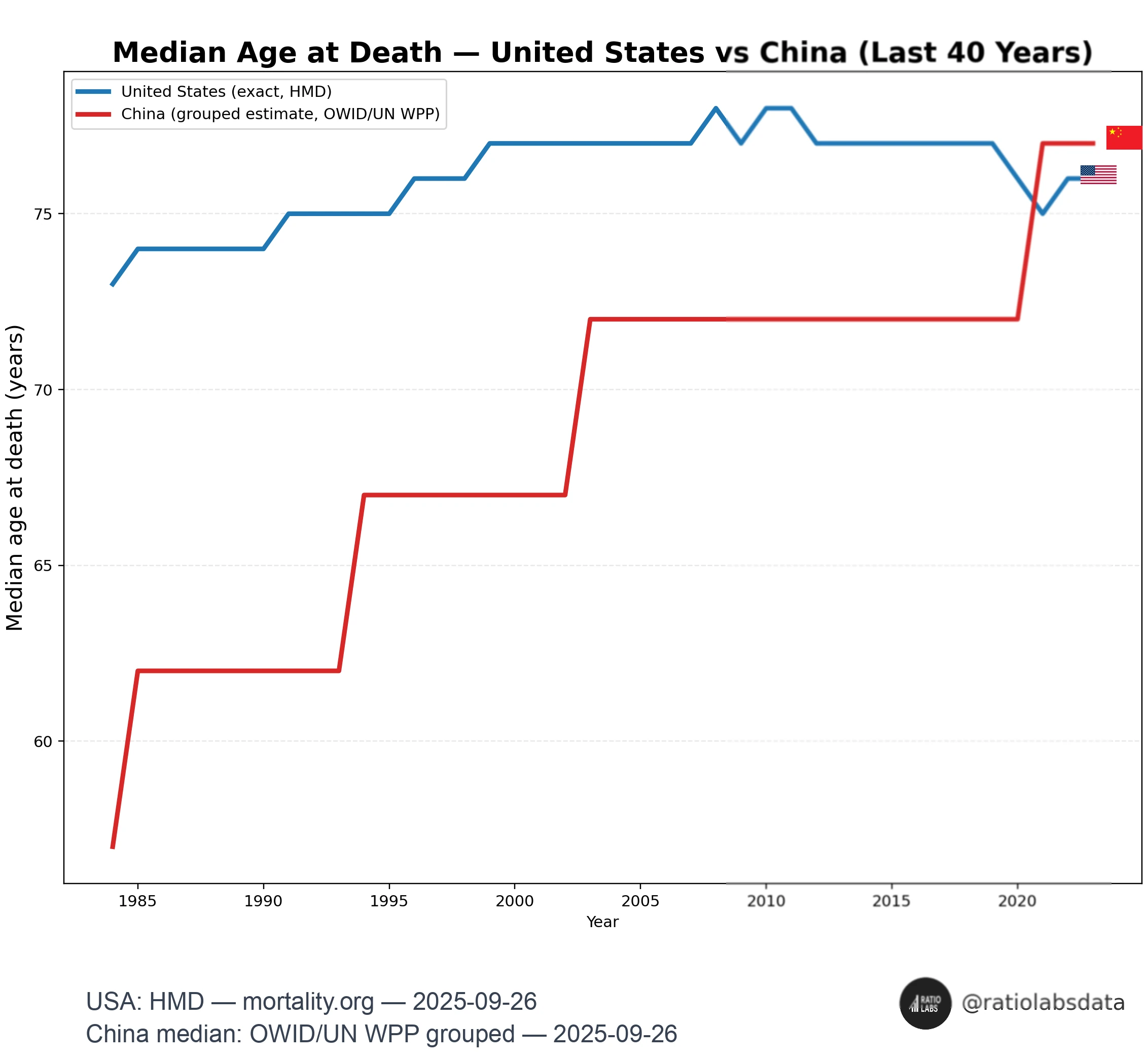 I’ve always believed that the real stories behind the numbers aren’t just in the spreadsheets—they’re in the lives they touch. Take a simple line chart plotting median age at death in the US and China over the past few decades. It’s not flashy, no dramatic spikes or crashes, just two steady climbs that tell a tale of transformation. On one side, the US holds a lead, hovering around 78 or 79 years in recent years, a testament to our advanced healthcare and lifestyle perks. But China? It’s closing in fast, surging from the low 60s in the 1980s to the mid-70s today, with projections whispering that it could match or even edge past us by the 2030s. That’s not just a demographic footnote; it’s a signal flare for anyone in American business eyeing the horizon.