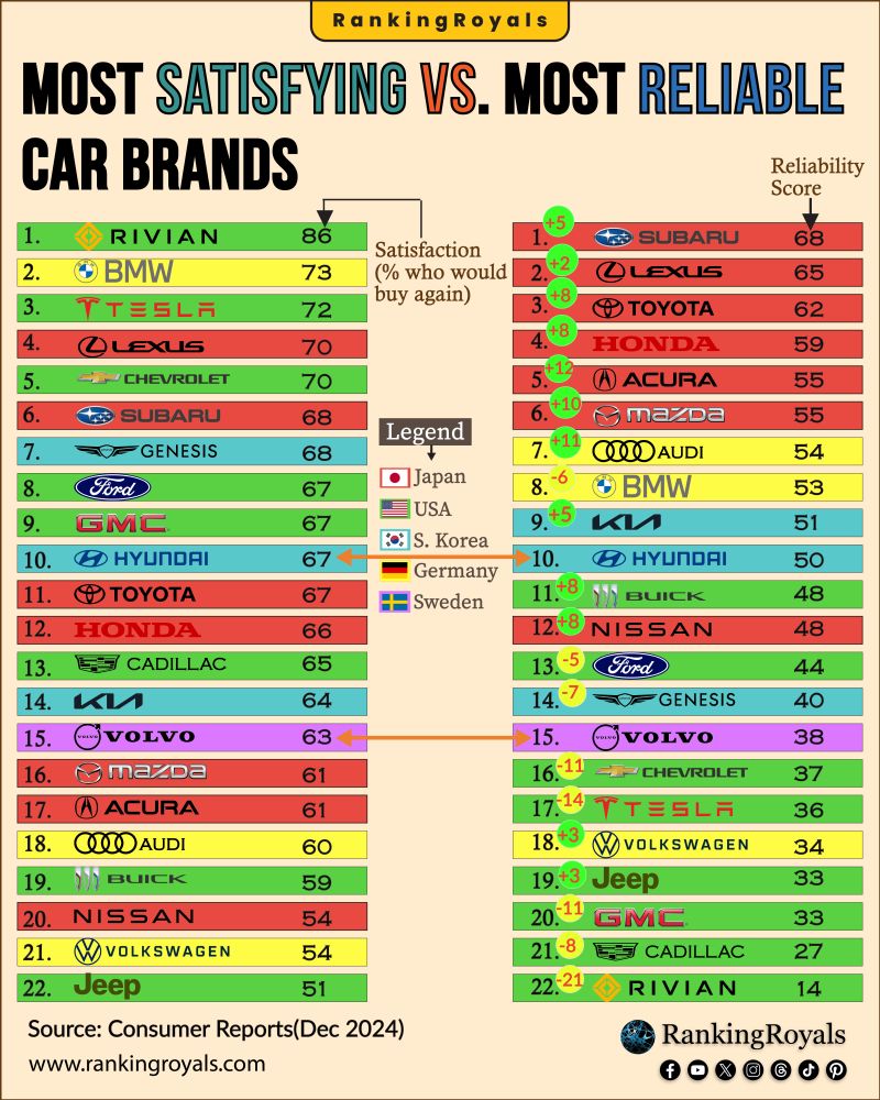Aus dieser Grafik kann man mehrerer Dinge ablesen. z.B., dass japanische Autos nicht zu den gehören, die am meisten befriedigen, aber zu den Zuverlässigsten. Deutsche Autos sind gar nicht so zuverlässig. Autokauf ist halt auch immer etwas Emotionales.
